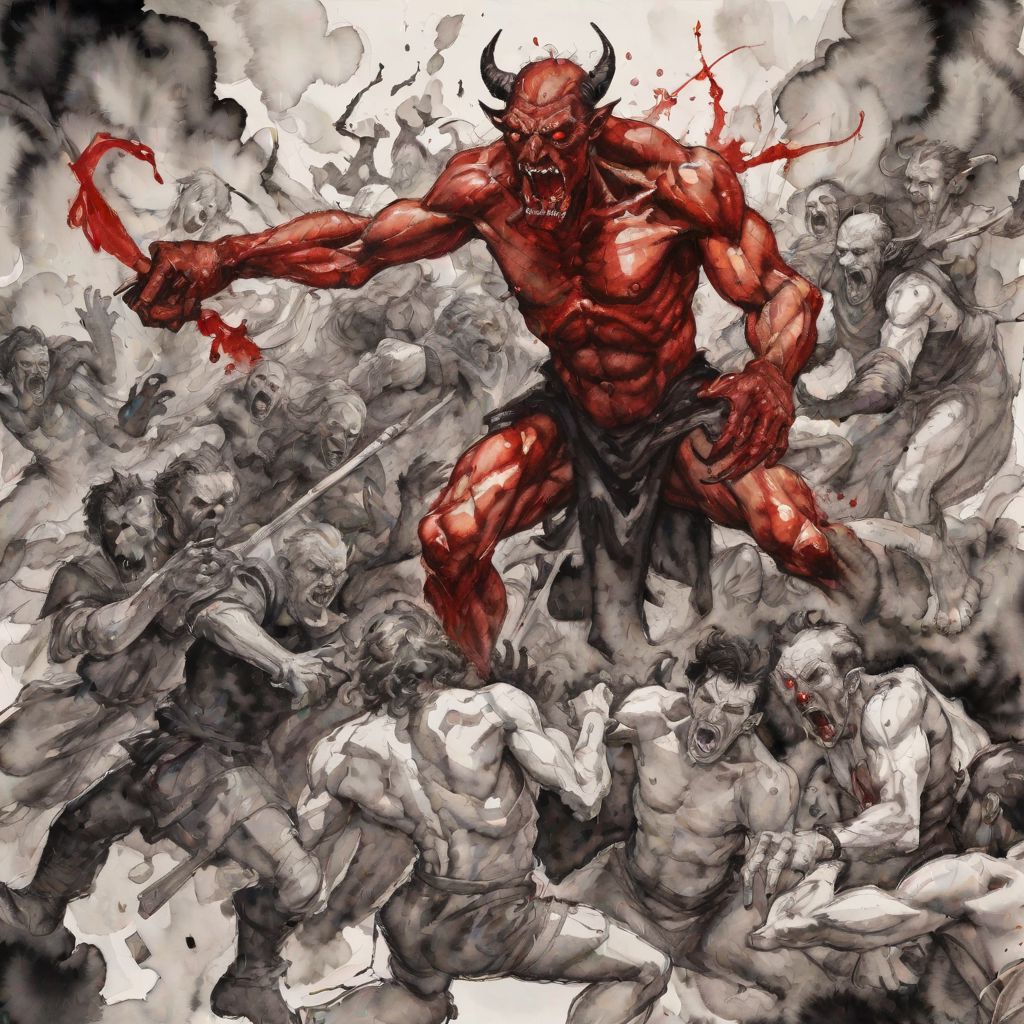 a horde of demons attack in a frenzy, epic battle, bloodstained, dnd, black and white and red, watercolor painting by (egon schiele and greg rutkowski)