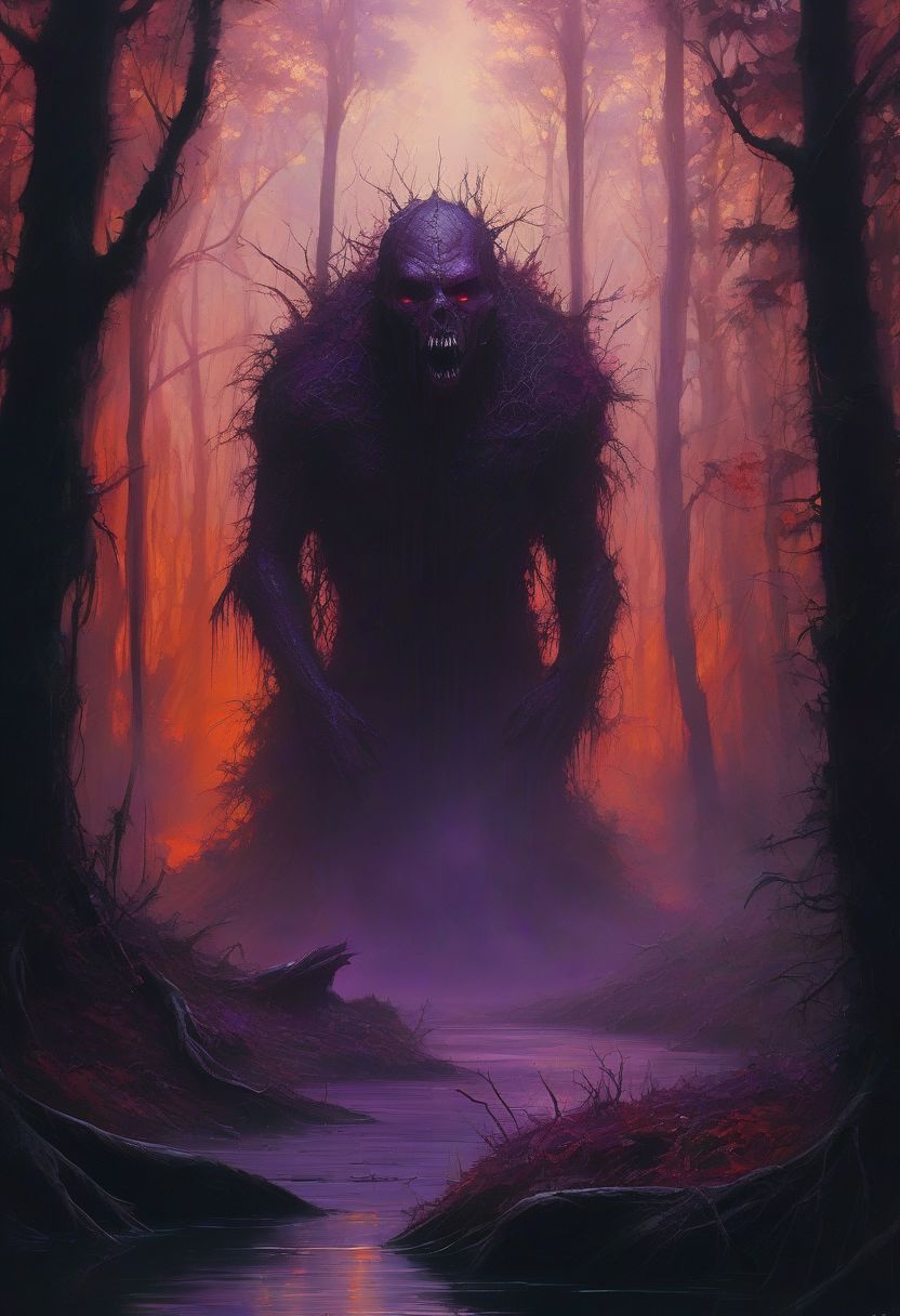 A mesmerizing, hyper-realistic digital painting of a dark and haunting Timberland landscape. The scene is set in a dense jungle, where the shadows of twisted trees loom over a spooky swamp. The water appears to be infected with a mysterious substance, and the atmosphere is filled with an eerie, horror-themed vibe. The colors are predominantly dark and moody, with pops of purple, red, and white that add to the overall creepiness. The artwork is meticulously controlled, with selective focus and a background blur that emphasizes the intricate details. The dramatic lighting, reminiscent of Stephen Gammell's style, casts deep shadows and highlights the dripping foliage. The overall effect is akin to the atmosphere of a scary horror metal music video, enhanced by godrays and a captivating, cinematic atmosphere.