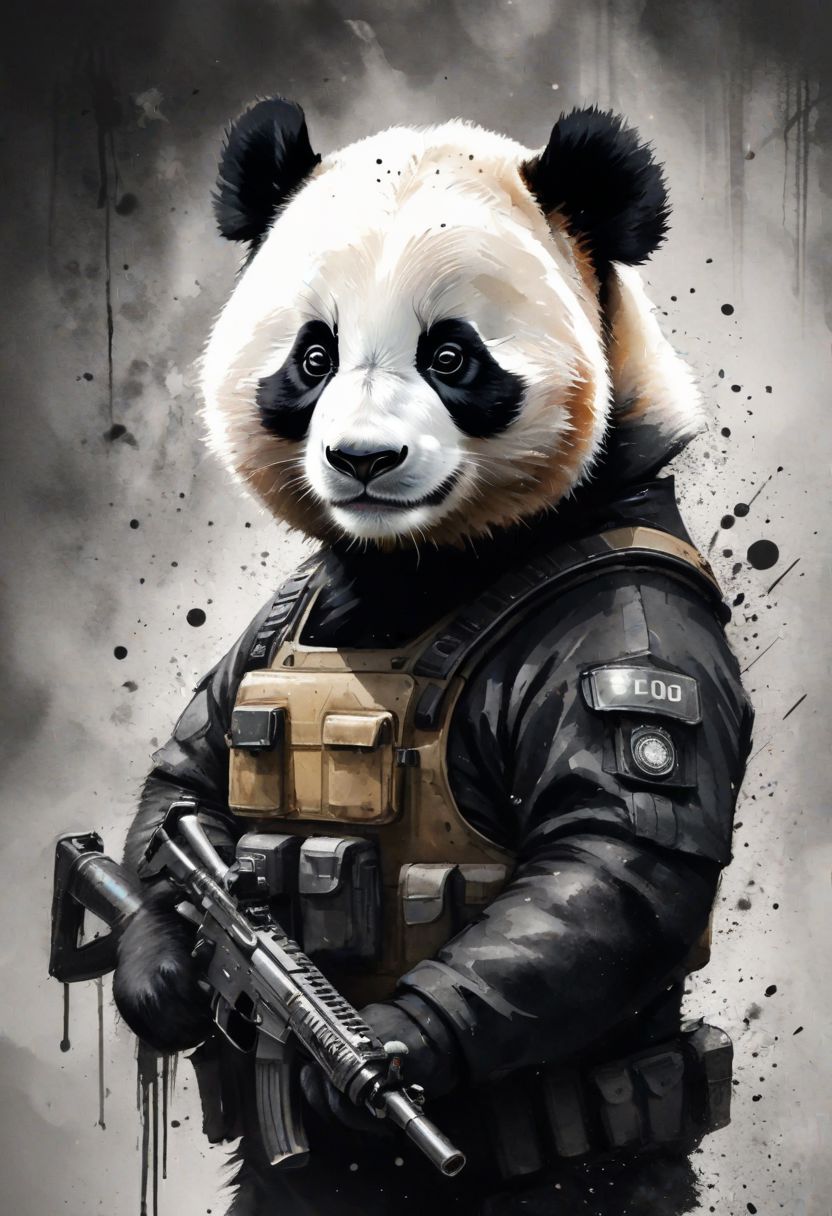 cute panda bear (holding a gun:1.2), capture a rebel attitude, swat helmet with goggles, ink illustration, CGI animation style, UHD, medium shot, add (fine detail:1.3) to the scene, perfect the (highlights:1.2) and (shadows:1.2) and (atmospheric light:1.2), pay attention to the (framing:1.2), create (rich:1.3) in detail atmospheric background to compliment the overall theme of the composition and bring it to life