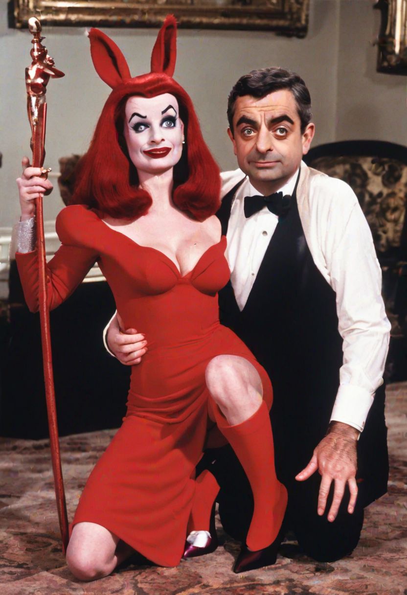 Rowan Atkinson, dressed as jessica rabbit from who framed roger rabbit, with toto