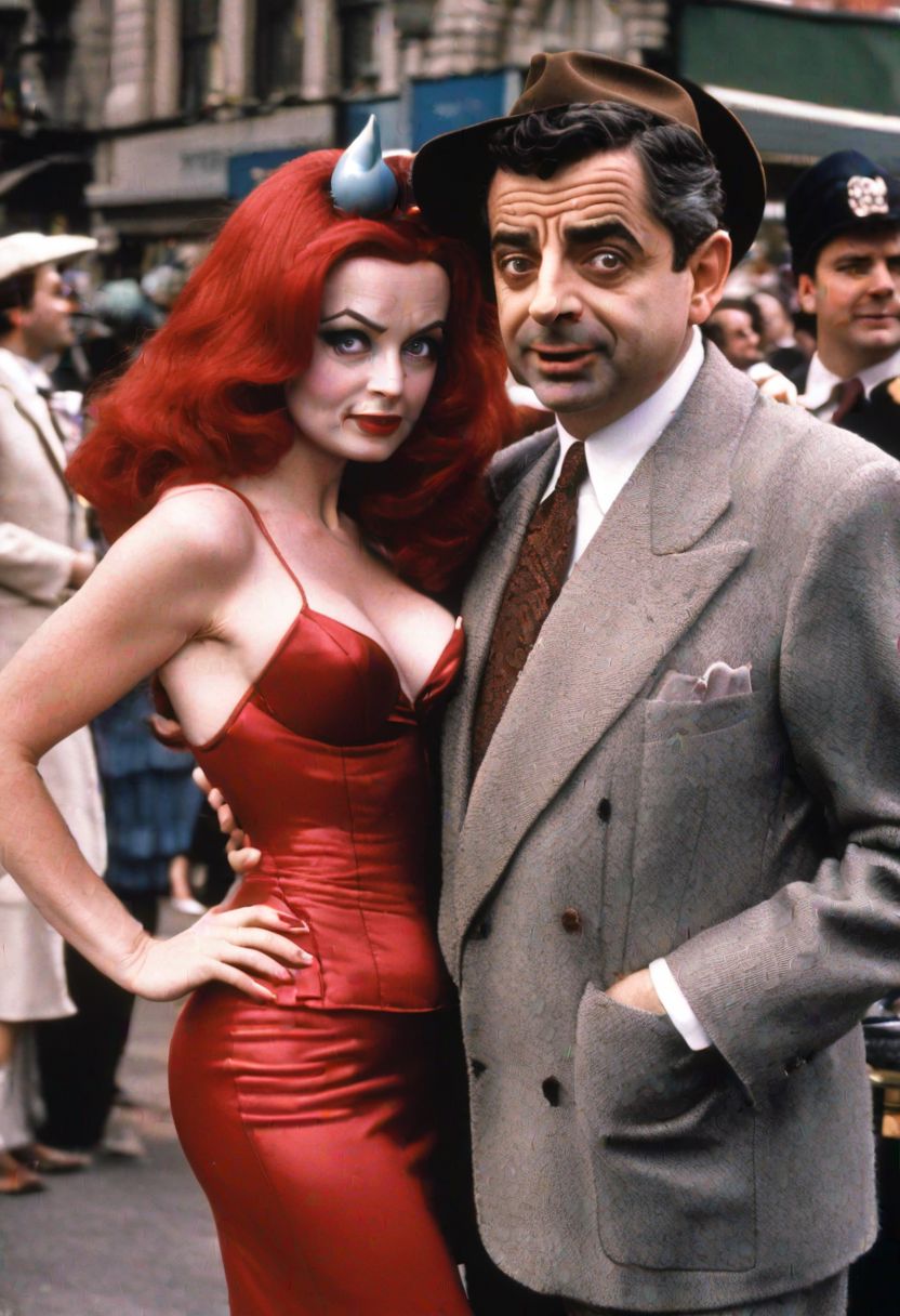 Rowan Atkinson, dressed as jessica rabbit from who framed roger rabbit, with toto