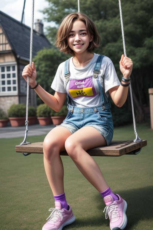 teenage girl, short brown hair, green eyes, purple tight ripped overalls shorts , smile, sneakers, village house background, sitting on a swing, average chest, pink t-shirt