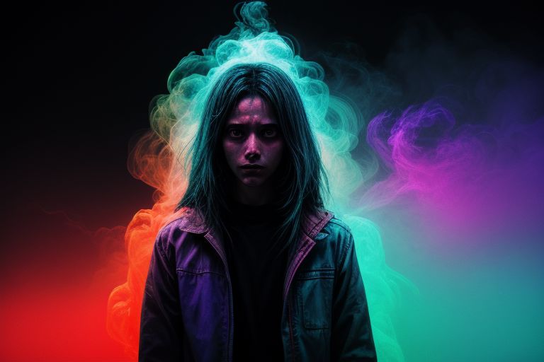 character Dark cinematic photograph, slow shutter photography portrait, lightstreaks, double exposure, smoke, haze, rainbow vibe, Holographic poltergeists, chaotically harmonious& whimsically gravitas, sublimely ridiculous and disconcertingly serene, neon colors blue/red, heavy filmgrain