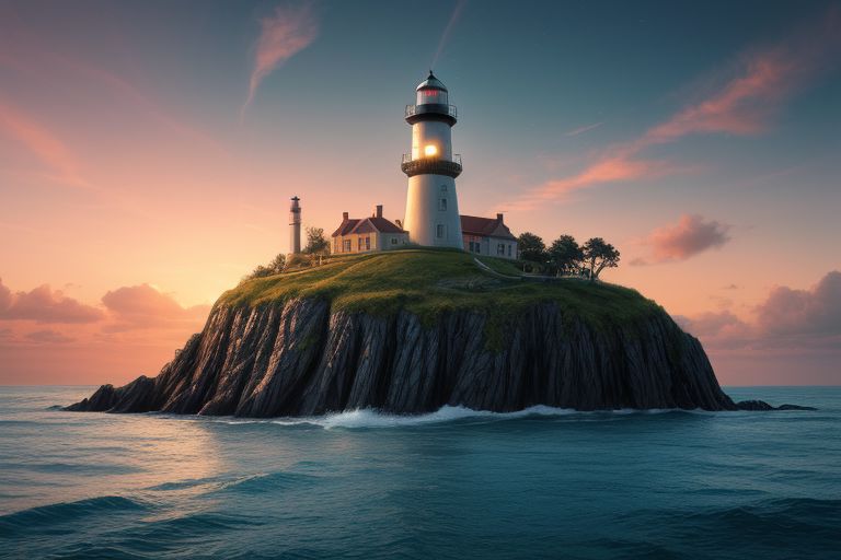 art An illustration of a glowing lighthouse on the ocean, in the style of mixes realistic and fantastical elements, dark cyan and gold, i can't believe how beautiful this is, tangled forms, imax, painted illustrations, panoramic scale