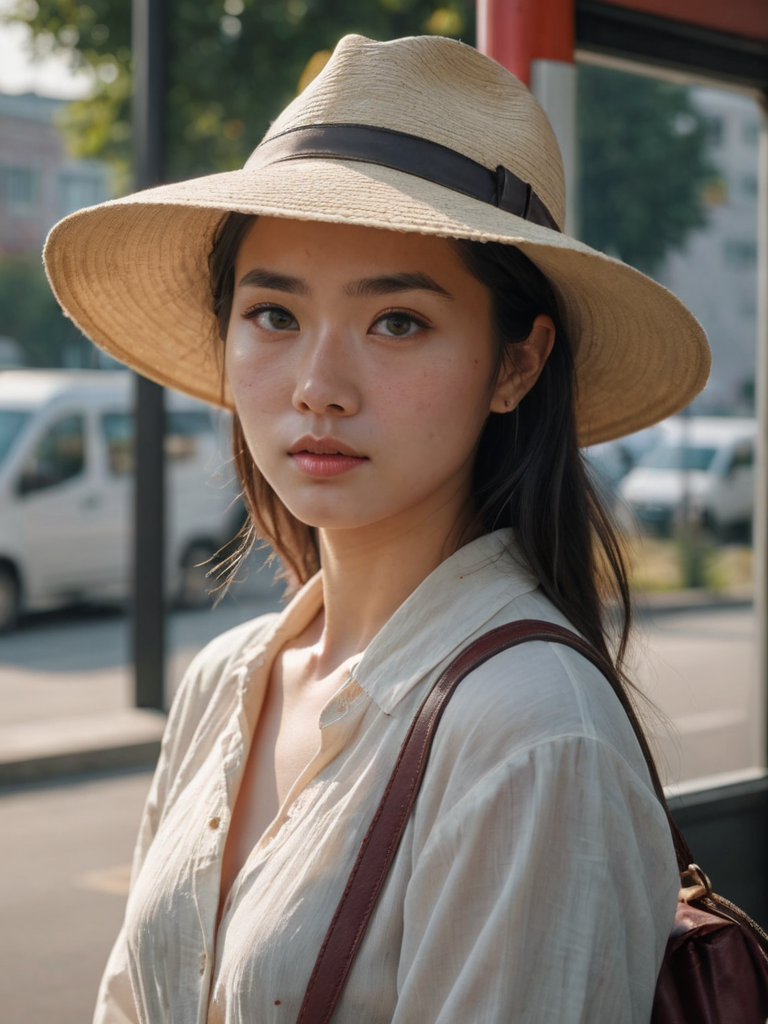 raw Photo,cinematic film still, cowboy shot, Movie film,upper body,photo of a young girl on the streets of a modern Chinese city. She stands at a bus stop,waiting for the bus. The sunlight shines on her face,making her anxious. She is gazing at the crowd,wearing a sun hat. Her face has soft lines,and her eyes are very beautiful, She was wearing a white summer dress with an LV bag on her shoulder., detailed eyes, realist detail,brooding mood,ue5,detailed character expressions,light amber and red, amazing quality,simulated film particles,wallpaper,analog film grain, (((detailed facial features))),(very detailed skin:1.2),realistic details, <lora:sd_xl_dpo_lora_v1:0.4>,
