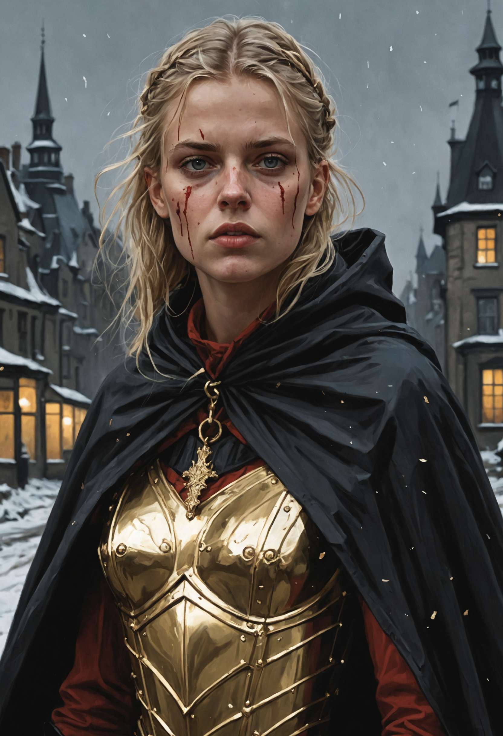 (in the style of lineart, flat art, comic, Jakub Rozalski:1.5), solo, 1girl, ((extreme close up shot) portrait of Marie Pie, a Russian woman, (a young woman:1.2), (tanned skin:1.5), (small natural breasts:1.15), (wearing a gold trimmed armor with a black cape:1.2), (very long ash blond hairs:1.2), (dark, night, horror, maniac, psycho, dangerous, creepy, dark house, horror movie still:1.3)