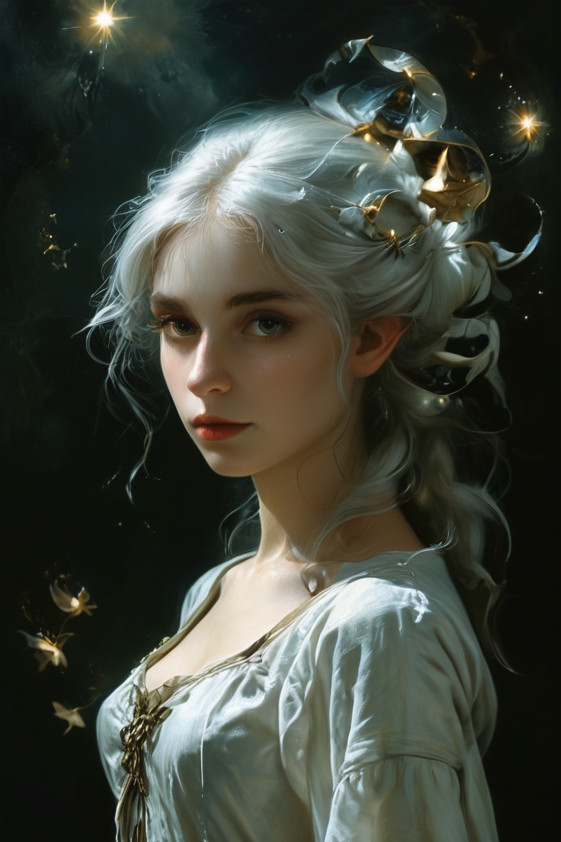 (art by caravaggio:1.3), (fantasy illustration of the world of tolkien:1.3), (female elf, long starlike silver hair, solo, white clothing:1.3) (Eärwen, known as the "swan-maiden of Alqualondë", was the daughter of Olwë, lord of the Teleri.:0.5) <lora:add-detail-xl:0.7> <lora:aesthetic:0.7> <lora:Into_Darkness:0.7> <lora:MJ52:0.4> <lora:ral-dissolve-sdxl:0.4> <lora:xl_more_art-full_v1:0.5>