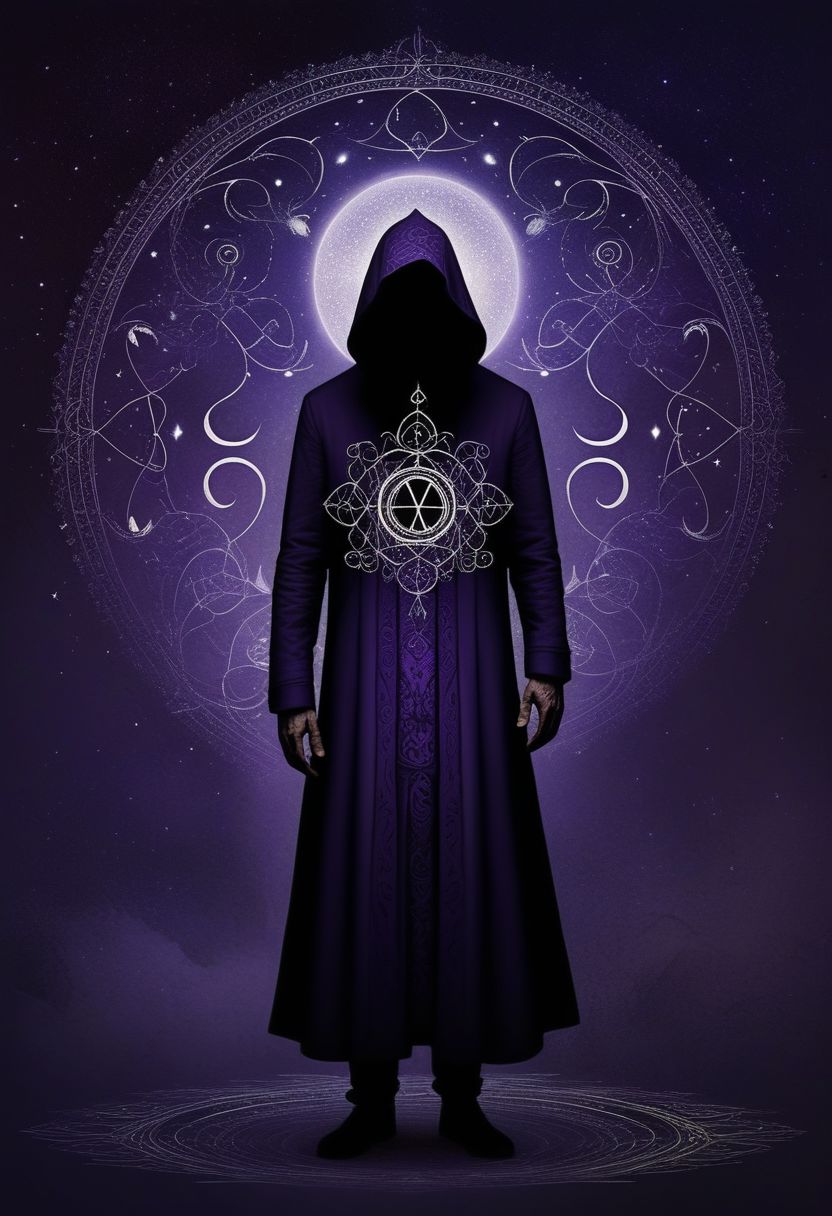 A mesmerizing digital art piece that combines ethereal mysticism and grunge elements. The charming character, with medium eyes, is adorned in dark purple clothing. They are surrounded by swirling magic energy, with a mysterious emblem on their chest. The artist, Andy Kehoe, is inspired by the styles of craola, Leonardo da Vinci, and others, creating a dynamic pose with dynamic light and shadow. The overall atmosphere of the piece is eerie and enigmatic, with a touch of bad dreams.