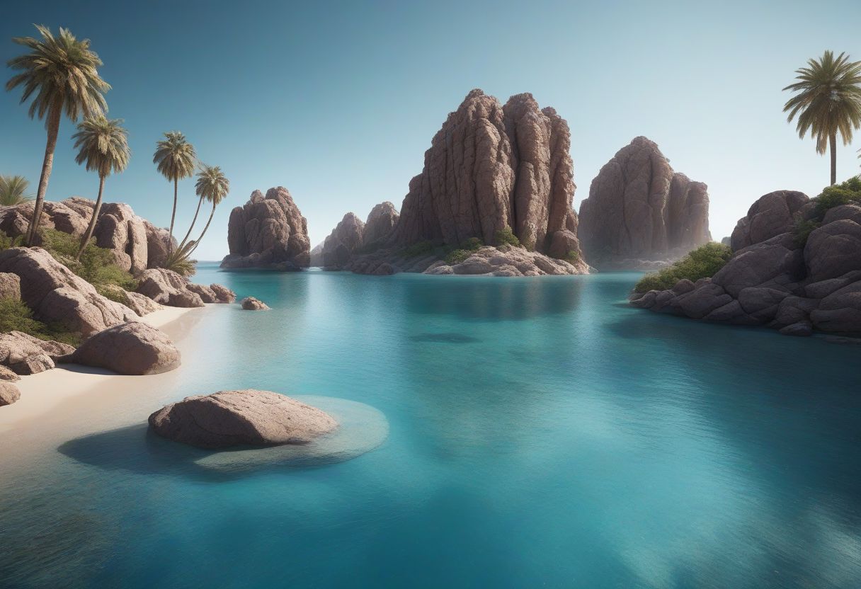 oasis, transparent blue water, calm, palms, rocks, nature,wide composition, 21:9, dynamic, great perspective, film grain, motion blur, cinematic, masterpiece, high quality, highres, absurdres, editorial, official art, artstation, dramatic, great composition, concept art, matte painting, hyperreal, photoreal, realistic, raw photo, detailed, ultra-detailed, intricate,