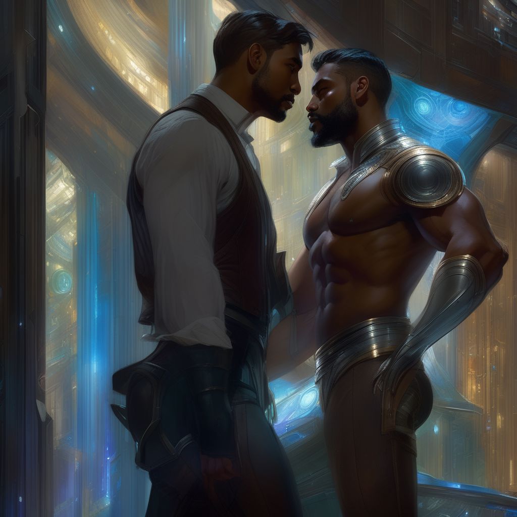 futuristic epic fantasy, science fiction, high-tech, legendary, dynamic, romantic, whimsical, magical, mythical. a homoerotic, homoromantic, gay, loving, exciting, steamy, magnificent, amazing, sexy, intense, dramatic masterpiece (by Daniel F Gerhartz|Gaston Bussiere|Maximilian Pirner:1.9) of R and M. M and R are both in their early 30s, extremely attractive, virile, powerful, masculine, hairy, strong, desirable, hunky, and manly men. M and R are wearing futuristic clothing resembling Robin Hood. R is a short, dark-brown-skinned, muscular, iraqi man, with very short hair, and a perfect beard. He is shorter than M. M is a tall, dark-tan-skinned, athletic, mexican protector, with very short hair, and a short beard. He is taller than R. The setting is indoors, in a bedroom, late at night. dynamic, interactive poses. The overall mood is provocative, passionate, expressive, sensual, magical, and visceral, evocative of gay romance, gravitas, and love. extremely detailed, romantic lighting, romantic mood, romantic atmospheric, shadowplay, vignette.