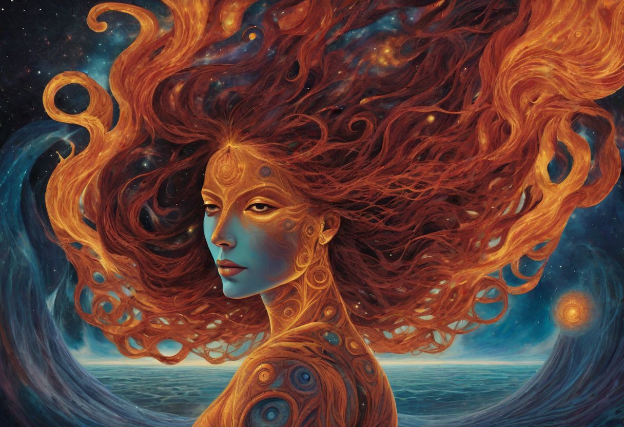 A cosmic void filled with swirling nebulae from which emerges the massive form of the mother goddess Danu, her body constituted of the primal sacred fires that will give birth to the universe. Her face is radiant and aglow, framed by waves of flaming red hair, eyes pooling with the promise of all creation.