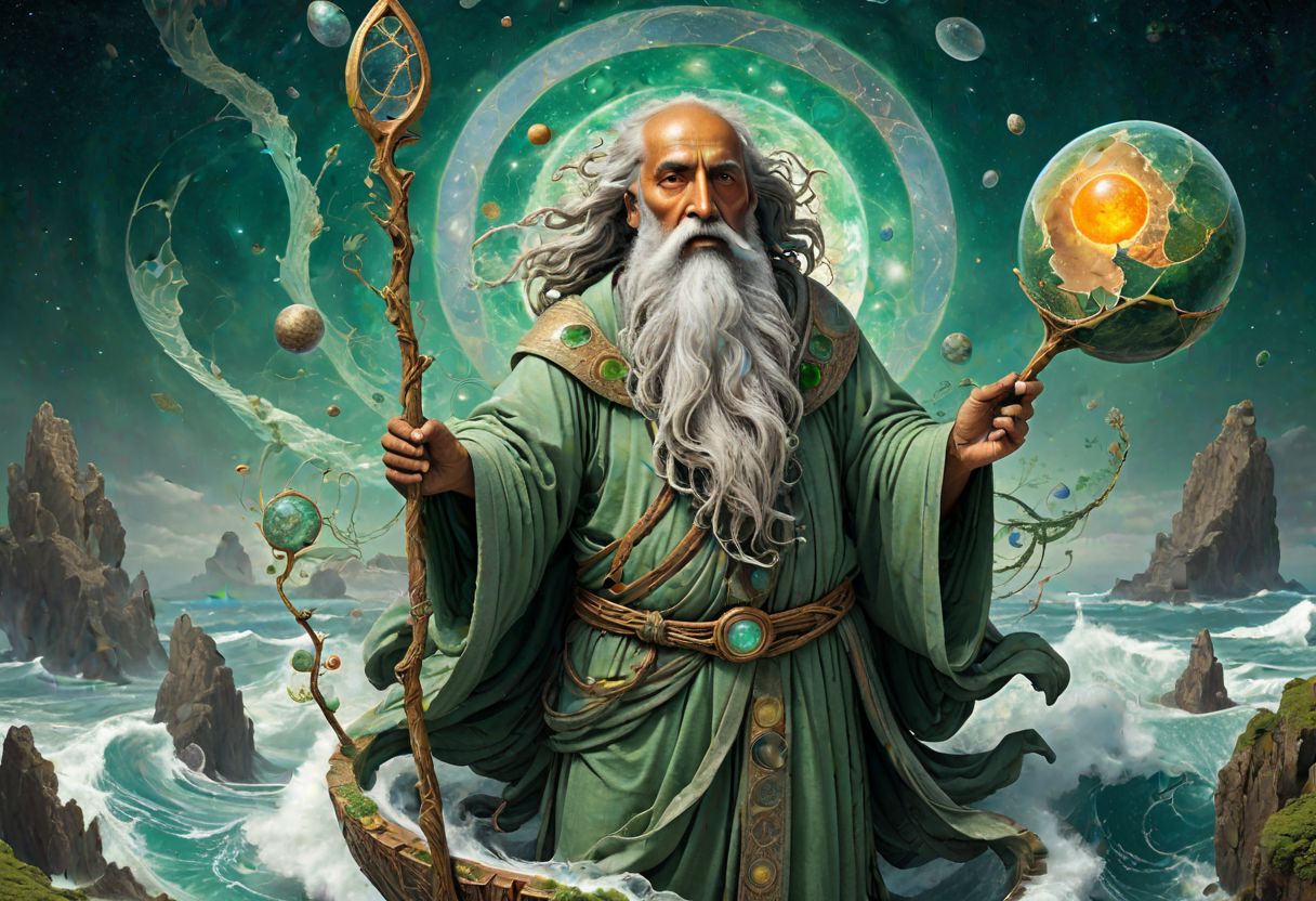 The fragments of the shattered cosmic egg forming into the celestial and terrestrial realms, with Bili the ancient poet churning the seas around a newly formed green world with his wooden staff. Bili appears as an aged man with a long grey beard and tattered robes, eyes filled with the wisdom of primordial times