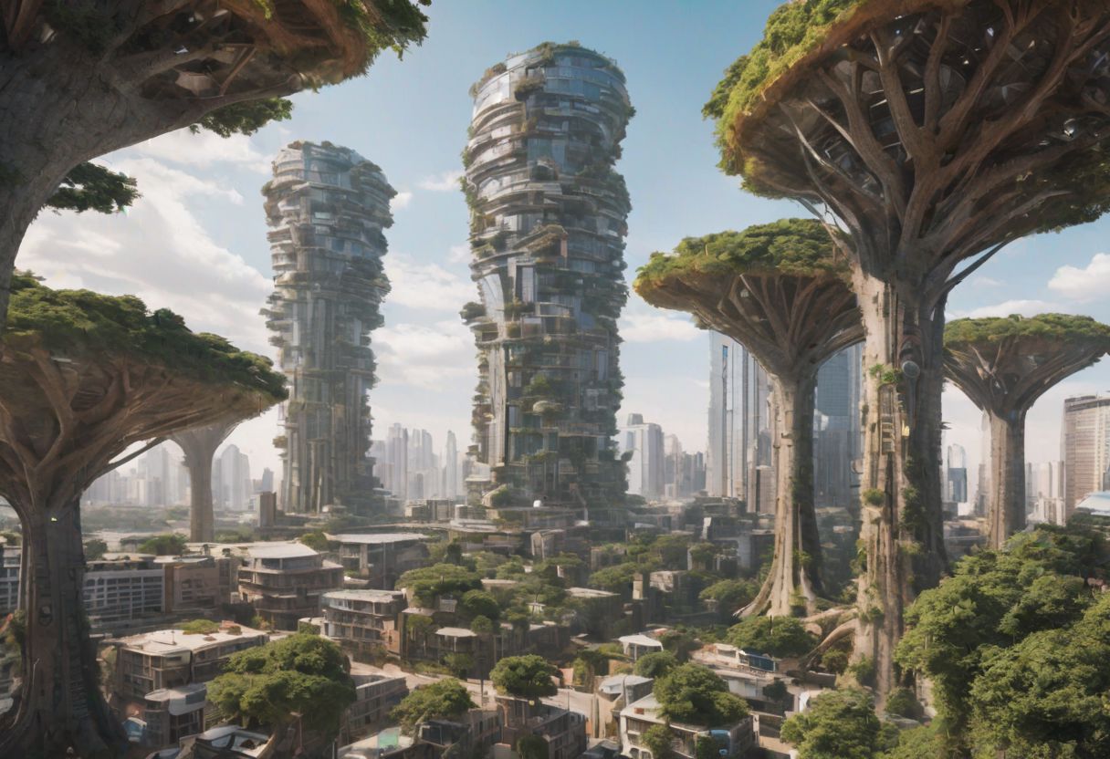 aerial view of three artificial baobab like skyscraper structure in a futuristic millennia city,on a harbor valley, , the architecture resemble a baobab tree big trunk and multiple tiny branchs architecture, [baobab-like-skyscrapers], A small planet excentered floating in space, a big one float aside moon-like covering more than half of the background, cinematic lighting, day photography, cyberpunk, postmodern, futurism