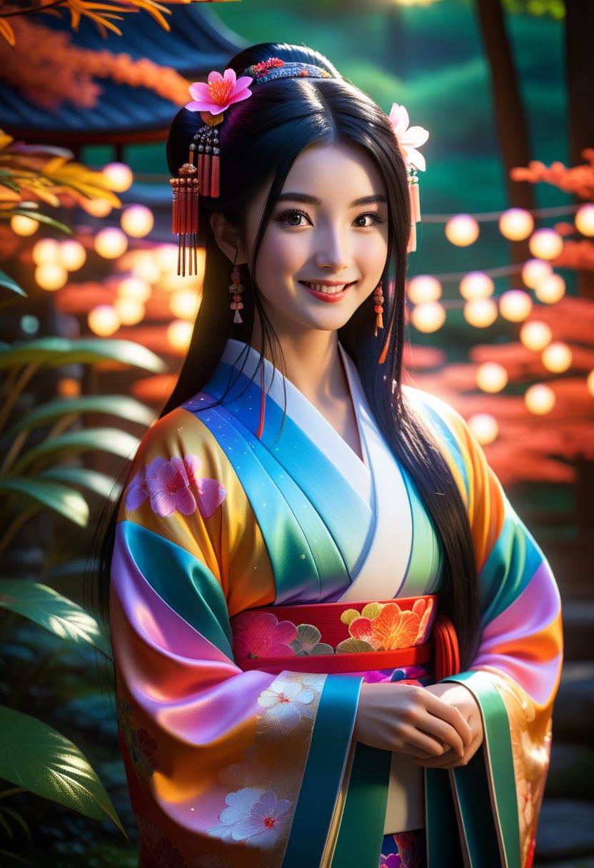 a girl, long black hair, smile, black slanted eyes, dressed in colorful Japanese clothing, walking through a Japanese garden, at dawn, BREAK RAW photo, DLSR, quality 8k, intricate, elegant, highly detailed, majestic, digital photography (masterpiece, side lighting, finely detailed beautiful eyes: 1.2), (highest quality: 1.1), (HDR: 1.3), (highest quality, best quality), realistic, high definition, BREAK immersive picture, vivid colors, volumetric light, cinematic light, light rays, lens flare, sparkles, glowing effects, (detailed background), full color, contrasting colors, highly detailed, attention to detail, octane render, award winning visual, depth of field, intricate details, rgb colors, warm backlit, fireflies, extremely detailed, hyper realistic, ultra sharp focus, light particles, cinematic, stunning visual masterpiece, highest quality,