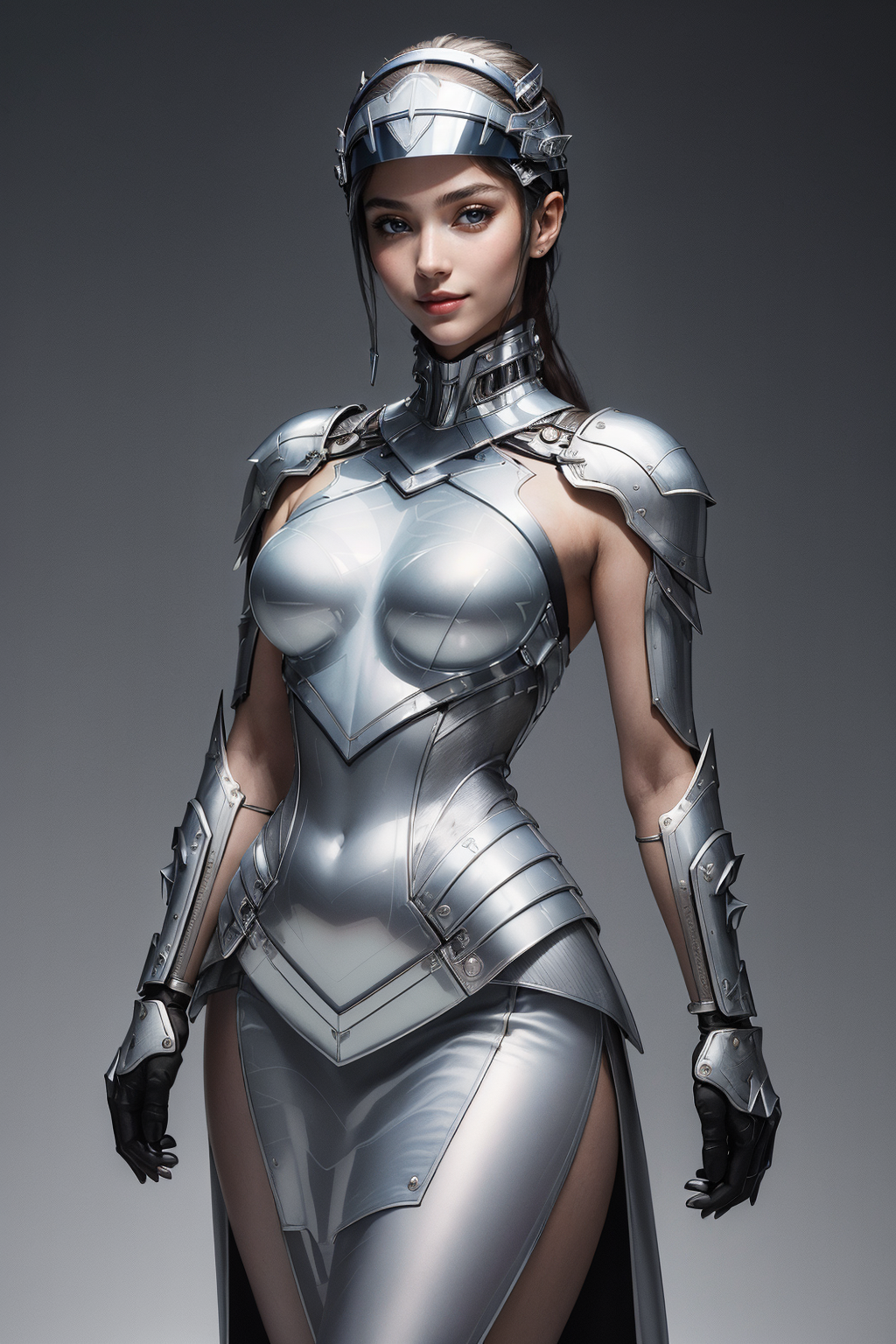 ((masterpiece,best quality,edgQuality)),(smile),1girl,solo,standing,posing, edgFut_clothing, a woman in a silver dress with a visor on her head ,wearing edgFut_clothing <lora:edgFutursticRediscovery:1>