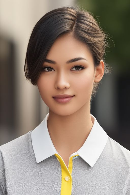 1girl, upper body, face focus, collared yellow shirt, short hair, dark hair, smirk, sweg, detailed skin textures, ((solo))