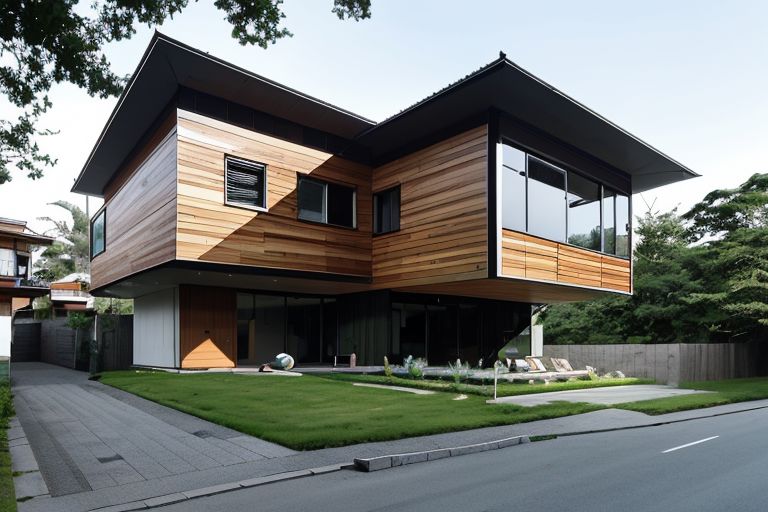 Irregular geometry modern house architecture, cantilever roof, house is surrounded by trees, majority facade is white walls, part of the wall's facade is covered by rattan