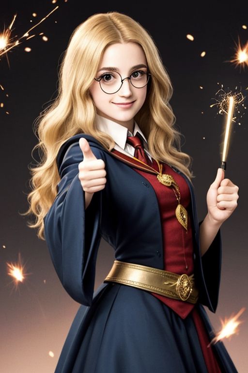 a woman, with blond hair, long hair, wearing glasses, slight smile, front view, dressed like Harry Potter, she carries a magic wand in her right hand, and makes a thumbs-up sign with her left hand, there is a bit of light and sparks coming out from the magic wand