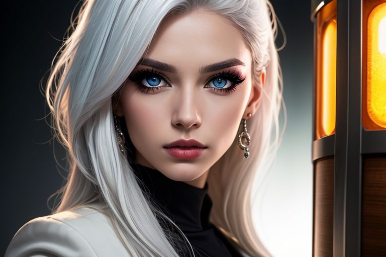 A movie capture, coffeehouse, close-up of a platinum-white hair woman, 1girl, (resemblance of ashleyBenson:0.6), (front lit: incadecent), dynamic pose, {aaton-penelope: 35mm, classic anamorphic feel: barrel distortion, gradual linear focus fall off, oval bokeh, and gorgeous amber lens flares}, atmospheric cinematography, grey eyes, formal attire, {Her: wild long hair, ((platinum-white hair)), highly detailed hair, smokey eye shadow, highly detailed skin, highly detailed eyes, alluring eyes, smokey makeup, (eyeshadow, eyeliner:1.1), Evenly shaped symmetrical pupils, beautiful, dramatic lighting, shallow depth of field, Ultra-realistic, beautiful lighting}, Artwork in the style of Michael Turner (Top Cow), Laura Braga, Randy Green, Akira Toriyama, (Gestalt Principles), Orange and Purple complimentary colors