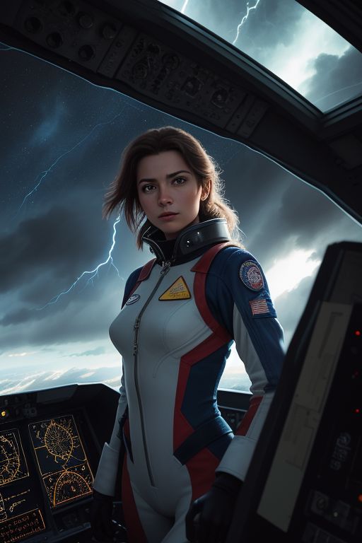 painting by Allen Anderson Beneath the swirling clouds of a distant gas giant, where lightning dances across the sky and winds howl with the fury of a thousand storms, a fearless pilot navigates her ship through the treacherous atmosphere in search of scientific discovery. Her features, illuminated by the soft glow of control panels and flickering monitors, speak of a life dedicated to exploration and adventure. Clad in a sleek flight suit adorned with patches from past missions and expeditions, she exudes an air of confidence and competence. With each deft maneuver, she pilots her craft through turbulent winds and swirling clouds, her hands steady on the controls and her eyes fixed on the horizon. Surrounded by the crackle of energy and the roar of thunder, she embodies the indomitable spirit of humanity's quest to push the boundaries of knowledge and understanding. action, PulpCover, pulp style, olfn