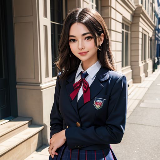 1girl, solo,(best quality),(masterpiece:1.1), (school uniform:1.4), dynamic angle, upper body, looking_at_viewer, platinum brown hair, green eyes, smile, dress, neck_ribbon, cute, clear facial skin,