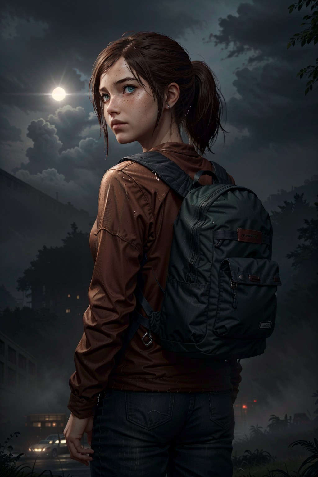 EEllie, 1girl, solo, realistic, brown hair, freckles, blue eyes, red shirt, layered sleeves, ponytail, masterpiece, best quality, cinematic lighting, <lora:epi_noiseoffset2:1>, <lora:Ellie:0.74>, looking at viewer, from behind, night, rain, clouds, (skycrapper:1.2), new york, dark buildings, city, overgrown, moss, grass, interstate, backpack,