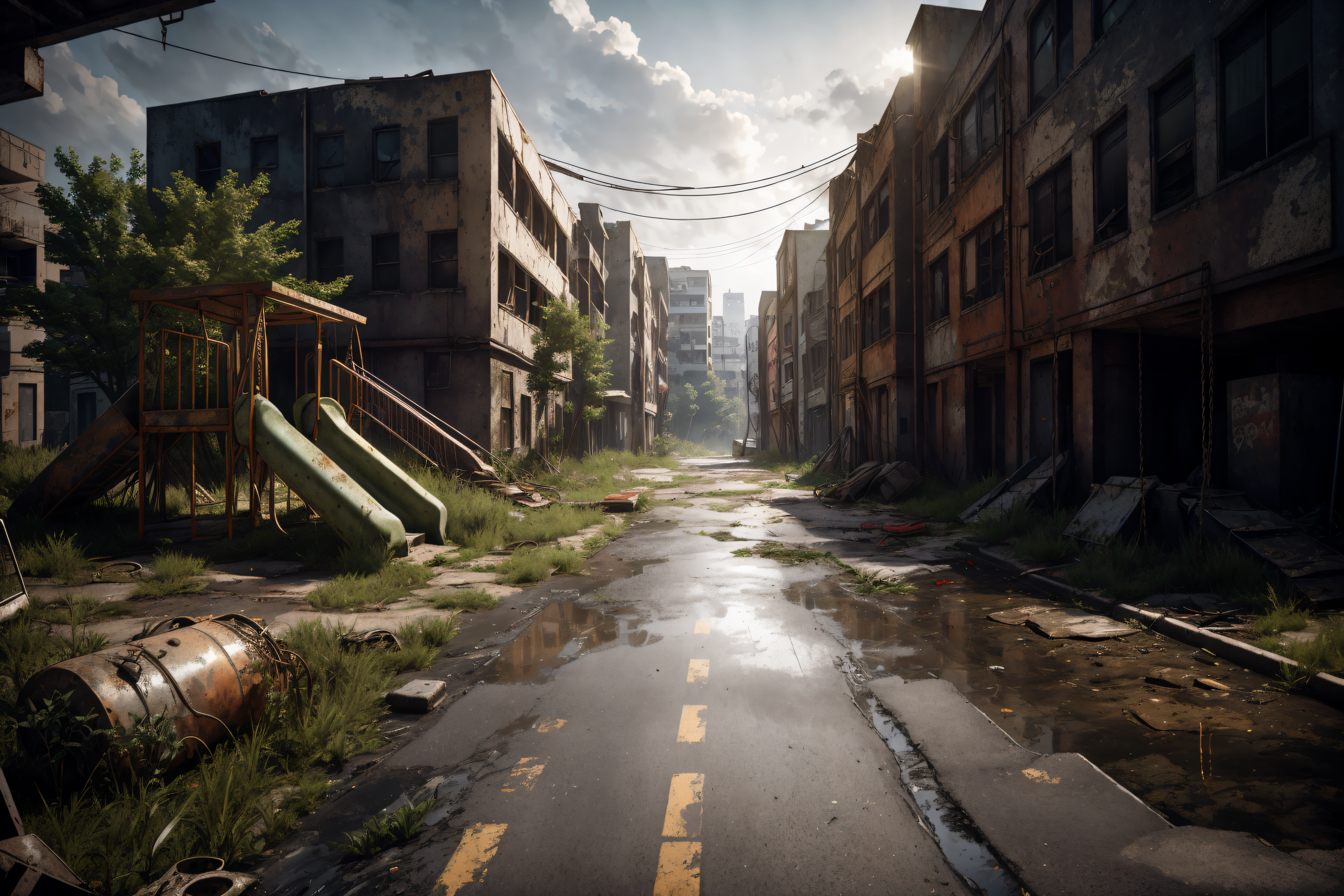 8k, realistic, vray, HDR, 6000K, on a post-apocalyptic playground, creaking swing set, rusted slide, weedy sandbox. <lora:PostApocalyptic_v4:0.6> SZ_4po enviroment