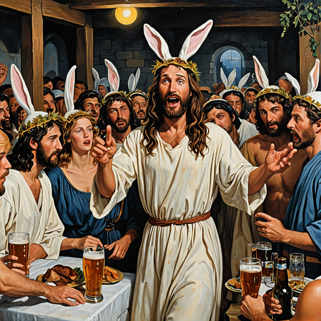 iconic painting of jesus from nazareth in womans dress, party, beer, bunny ear hat, drunk, orgy, night <lora:add-detail-xl:1.5>