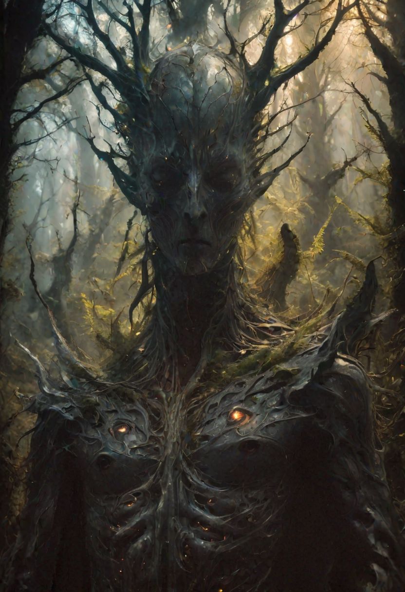 macro shot of a glowing dark forest spirit, dead leafy appendages outlined with veins of curse, eyes a deep, enigmatic glow amidst the foliage.