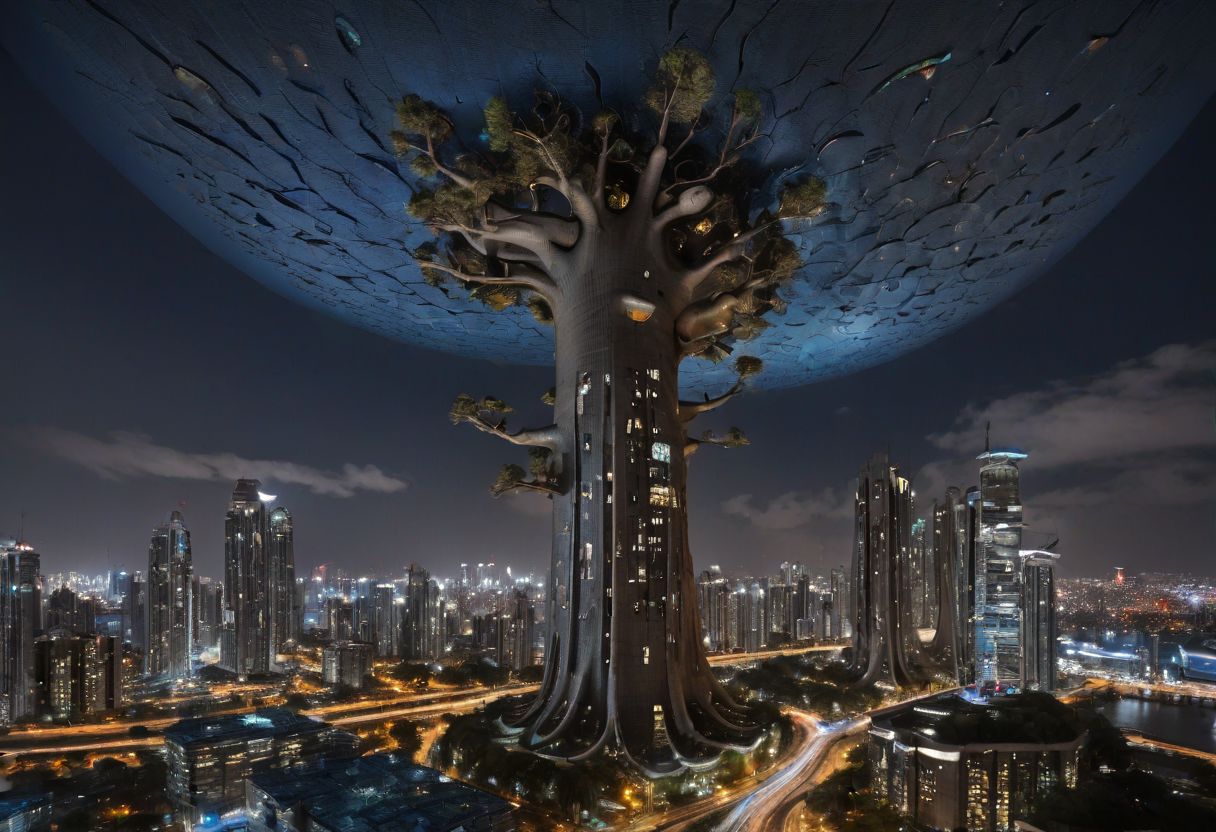 nightly photo of A (small planet:1.3) floating in the sky , and (another big planet:1.4) also seen on the sky floating aside moon-like covering more than half of the background, three artificial baobab-tree like skyscraper structure in a futuristic millennia city,on a harbor valley, , the architecture looks alike a baobab tree big trunk and multiple tiny spreading up branchs architecture, [baobab-like-skyscrapers], antigravity technology, cinematic lighting, nightly photography, cyberpunk, postmodern, futurism