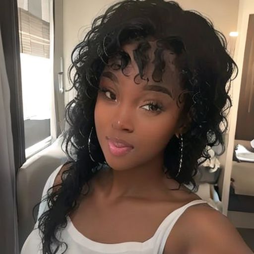 a ebony black woman with curly hair is taking a selfie, mug shot, sza, cocky smirk, there is a glow coming from her, perfect face template, inspired by Nene Thomas, blunt bangs fall on her forehead, 1 4 4 p, zoomed out shot, irisdicense, lowres, cgosciety, bixbite, orb, jasmine