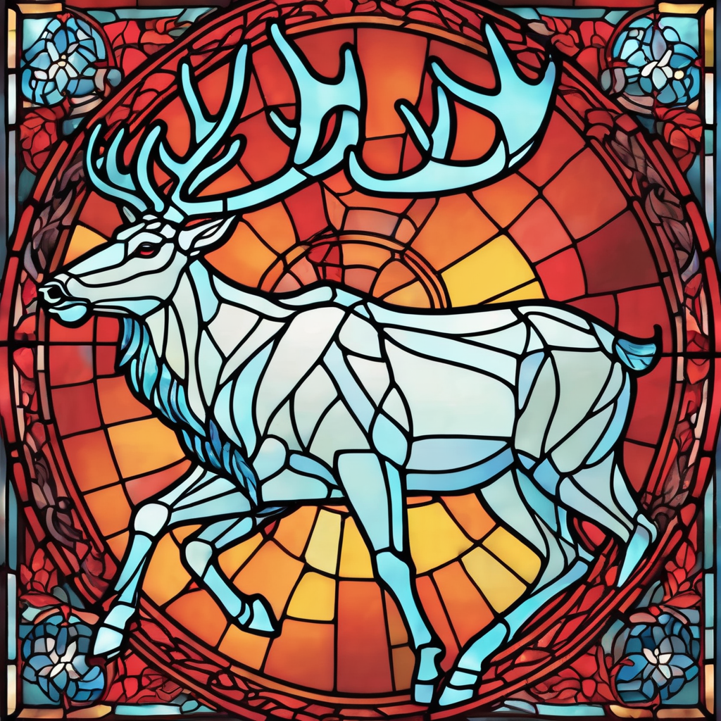 Stained glass style Sports logo, Red theme, "Raging Reindeer" . Vibrant, beautiful, translucent, intricate, detailed