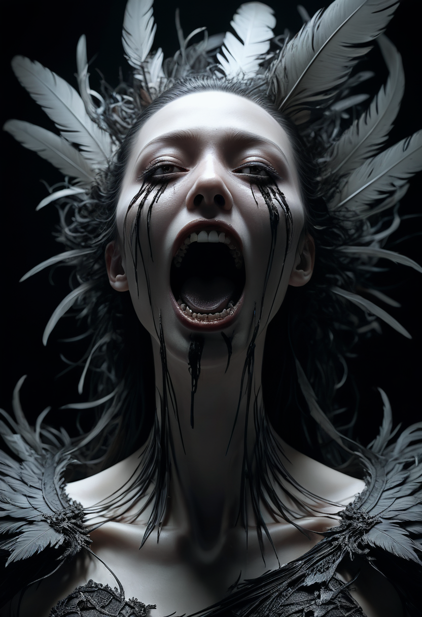 Horror-themed famous artwork by (ruan jia:1.2), (dramatic scene:1.3), (fractal art:0.4), dynamic angle, an fluidic female with feathers skin, looking Relieved, Mouth turned up slightly, eyes wide open, and a relaxed jaw. into the camera <lora:add-detail-xl:3> . Eerie, unsettling, dark, spooky, suspenseful, grim, highly detailed