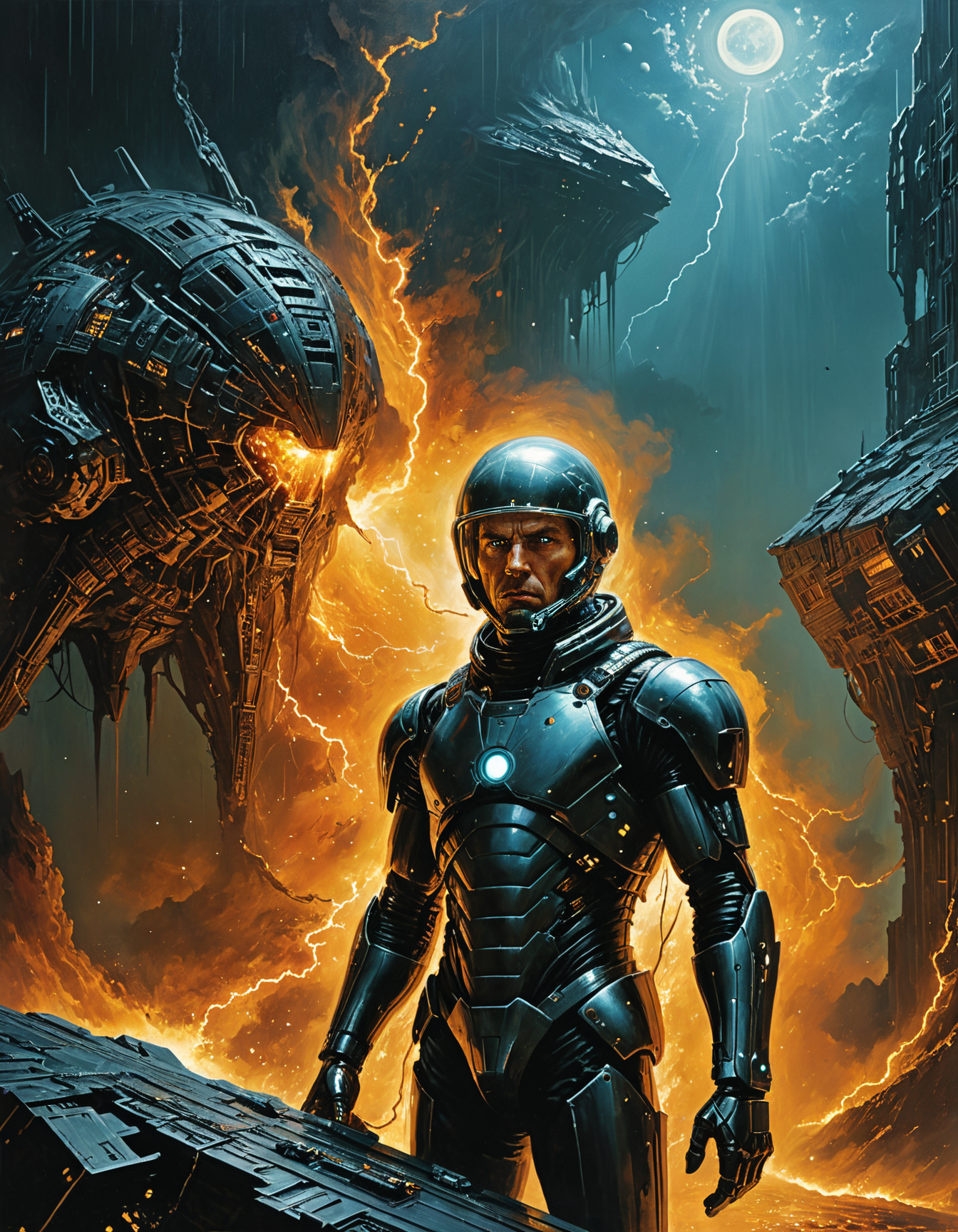 ([by Ed Emshwiller|by Hans Holbein the Younger]:1.5), (In the depths of a cyberspace, raging storms fill the air, engulfing the darkness with an intense energy. Cybercrime consumes everything in its path, and their identities are revealed behind a cloak of invisibleity. The air crackles with tension as they navigate the labyrinthine depths of the virtual realm, their identities concealed behind a cloak of unyielding secrets.:0.5) (Space opera:1.3) <lora:xl_more_art-full_v1:0.5> <lora:add-detail-xl:0.7> <lora:MJ52:0.4>