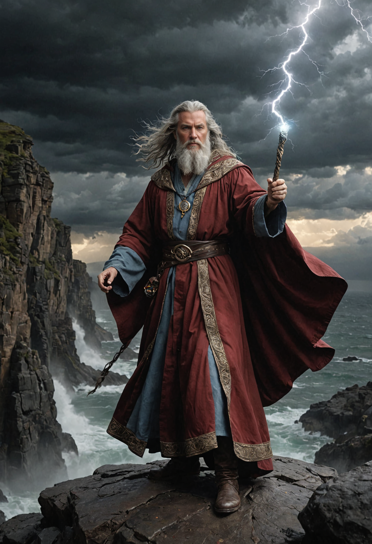 Photorealistic image of a majestic wizard standing atop an ancient, towering cliff during a powerful storm. The wizard, robed in a flowing, intricately embroidered cloak that whips about with the wind, raises a staff skyward, channeling the swirling energy of the storm. His beard and hair are wild and white, glowing subtly with a magical luminescence that reflects the stormâs energy. The staff is topped with a large, glowing crystal that pulses with vibrant colors, casting beams of light that scatter across the dark, roiling clouds above. Lightning arcs dramatically in the background, striking the ground and illuminating the ancient runes carved into the rocks around him. The scene is imbued with a palpable sense of ancient magic and raw elemental power. The ground beneath his feet glows faintly with mystical symbols, hinting at hidden powers being awoken. This scene is captured from a slightly low angle to emphasize his imposing presence against the expansive backdrop of the stormy sky. Shot on a RED Digital Cinema Camera at 8K resolution, ensuring every magical detail, from the intricate patterns of his cloak to the dynamic expressions of the elemental forces at play, is captured with stunning clarity.