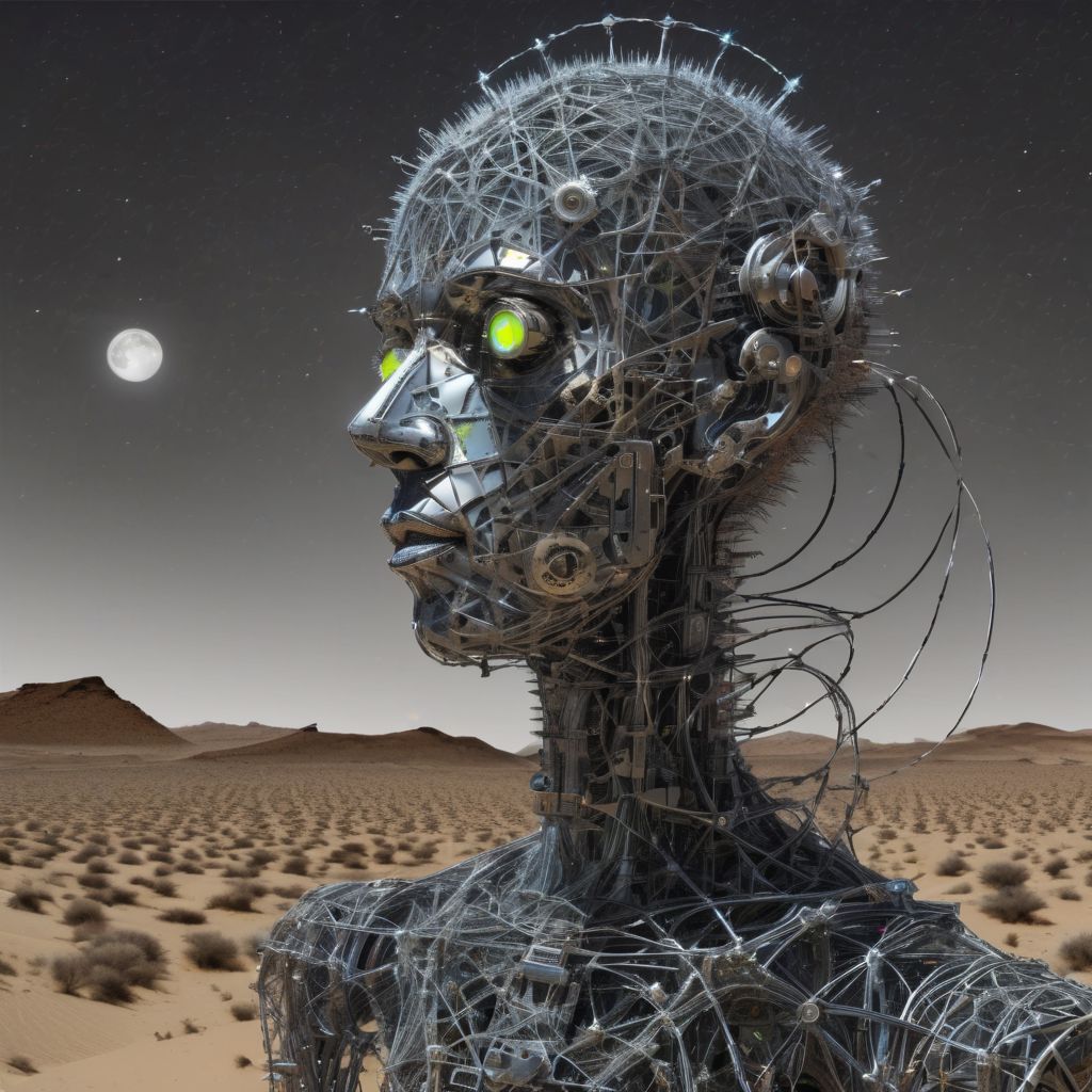 mechanoid escher Mandelbrot humanoid made of barbed wire, a fractal texture, with neon fluorescent eyes and tongue out. Blades and spike needles face. Liquid silver skin mercury hands pinpoints cameras. Hundreds of cables. Circuits. Perceptrons heuristic neutral networks. Don maitz wasteland full Moon desert
