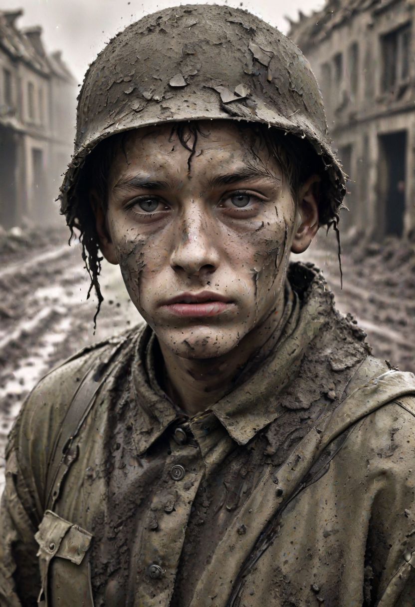 ww2 cinematic opening still, war photography, urban warfare, ww2 europe, performance focused cinematography, portrait of a young scarred soldier in oversized clothes, movie poster, sad, mud covered face, [wet ground], ral-dissolve