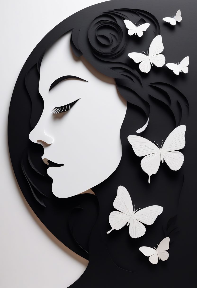 Create a pearl white background. Paper cut style in black paper of a womans face with a butterfly next to it. Minimalist