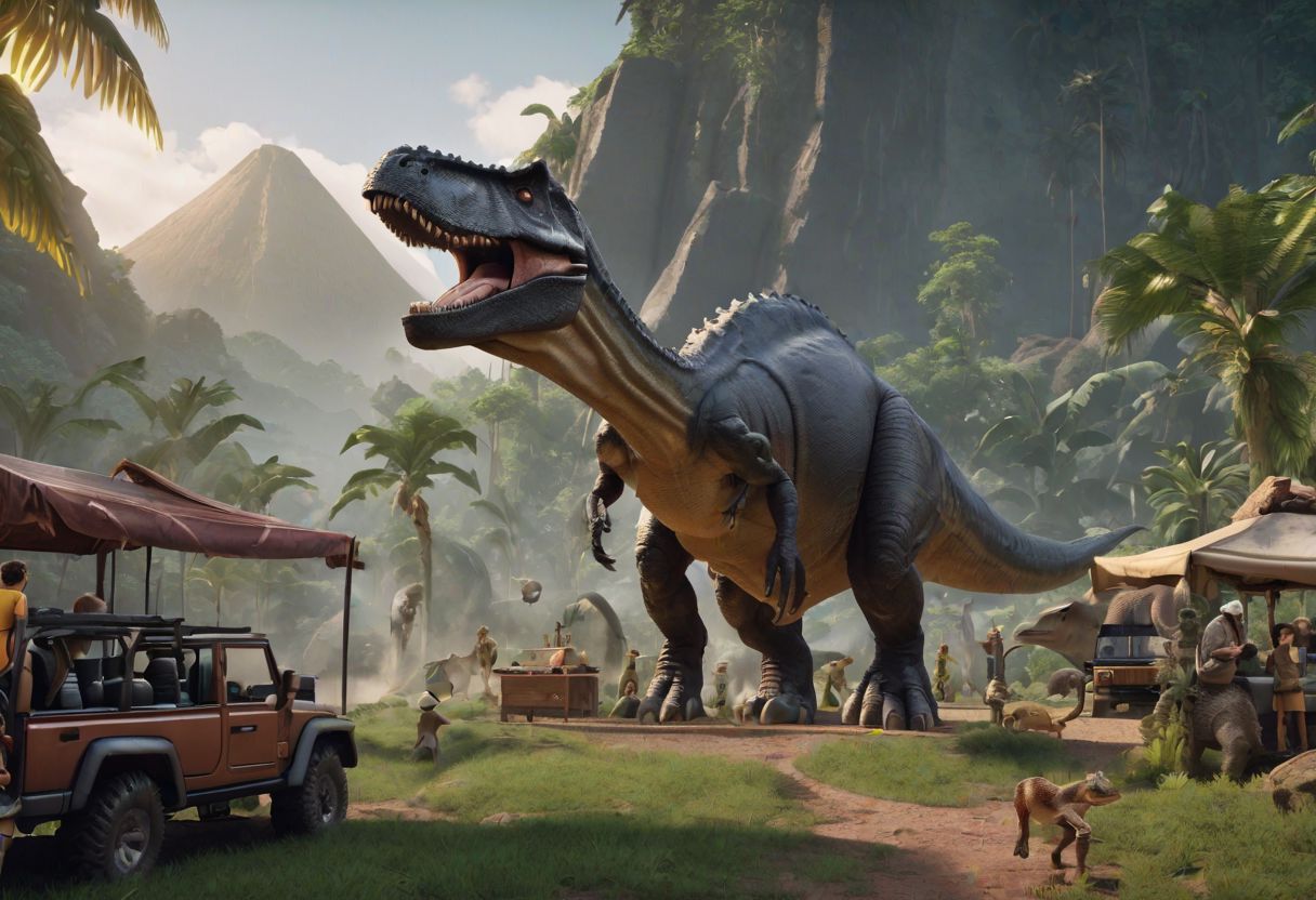 made-of-plastic action figures, Create a highly detailed epic cinematic concept art CG render digital painting artwork: dinosaur-themed adventure playset with a jungle setting, hidden temple, and a volcano. Include dinosaur figures, explorers, vehicles like jeeps and helicopters, and accessories like traps and fossils. Inspired by Jurassic Park and trending on ArtStation. Subtle muted cinematic colors, made in Maya, Blender, and Photoshop, octane render, excellent composition, cinematic atmosphere, dynamic dramatic cinematic lighting, precise correct anatomy, aesthetic, very inspirational, arthouse.