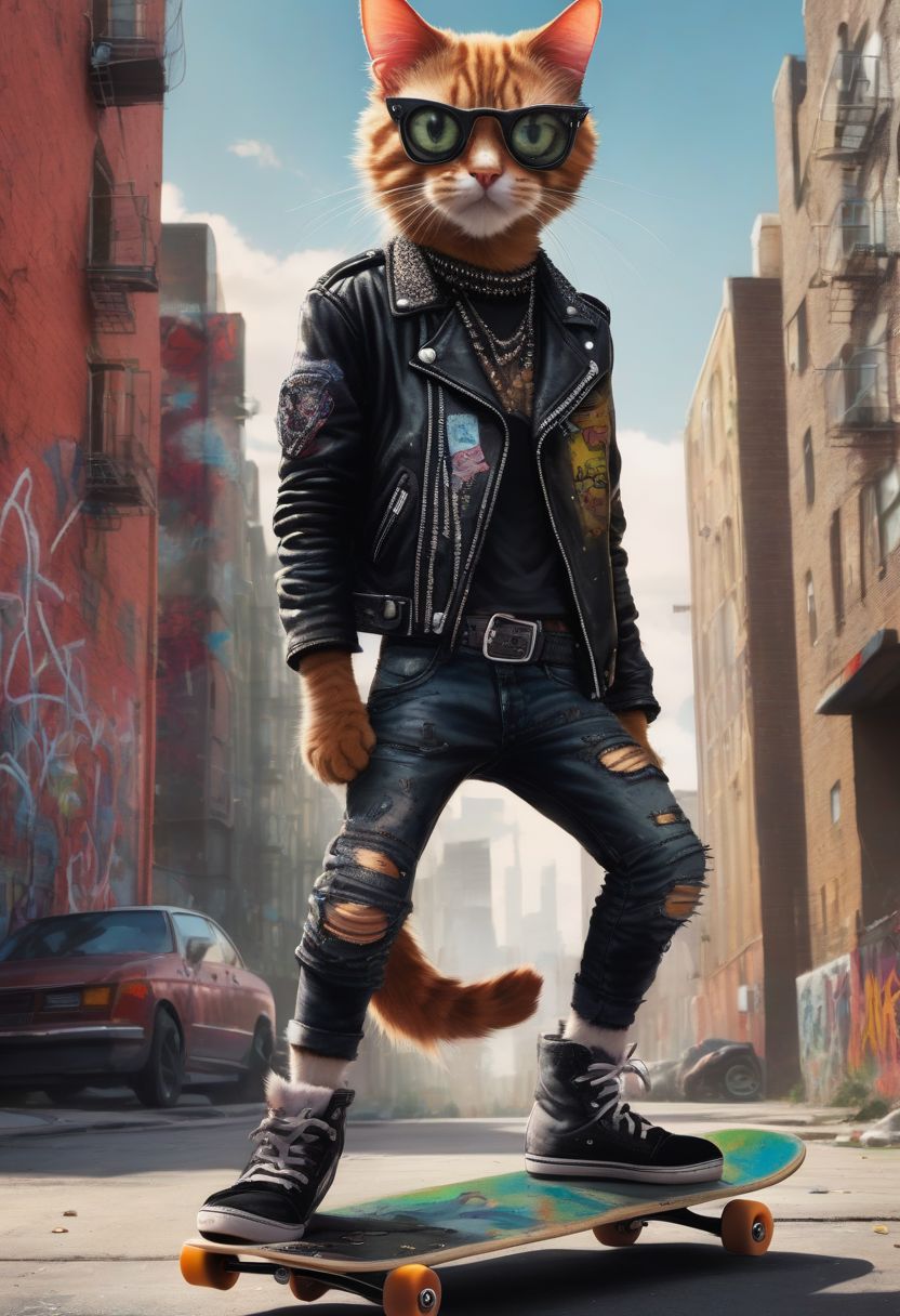 A captivating image of a punk cat with a Mohawk, wearing a studded collar and a leather jacket. The cat is standing with a rebellious posture, holding a skateboard. The background is a gritty urban street scene, with graffiti-covered walls and a distant city skyline.