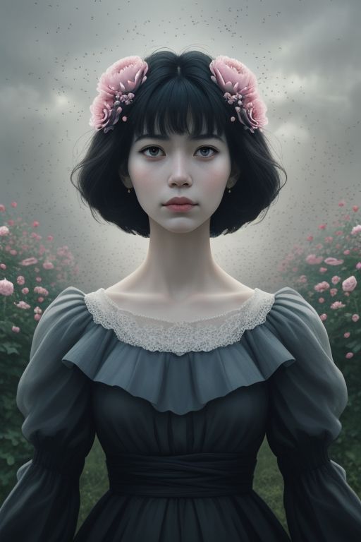 1 woman, beautiful, elegant,portrait to the middle of the body, peony flower dress, swarm of bees flying around, epic frame, gloomy atmosphere, geometric decorations, the highest detail, 2d, Inspired by Artgerm, the greatest quality