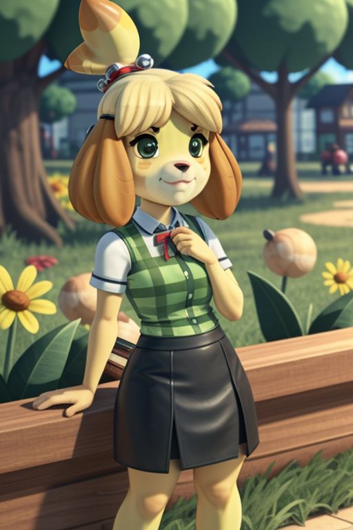 uploaded on e621, explicit content, crisp image, sharp focus, clean lines, cutesexyrobutts, hioshiru, cooliehigh, female, isabelle, three quarter portrait, (park setting), standing, clothed, clothing, (new leaf outfit, skirt) <lora:Isabelle:1>