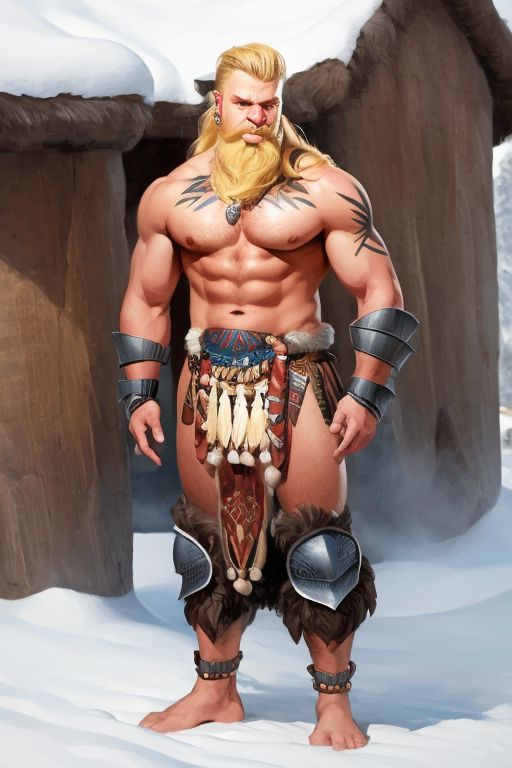 (Pathfinder art:1.2), (masterpiece, best quality), intricate details, 1boy, beard, single character, blonde hair, barbarian armor, tribal tattoos, many piercings, winter, full body, <lora:add_detail:1>