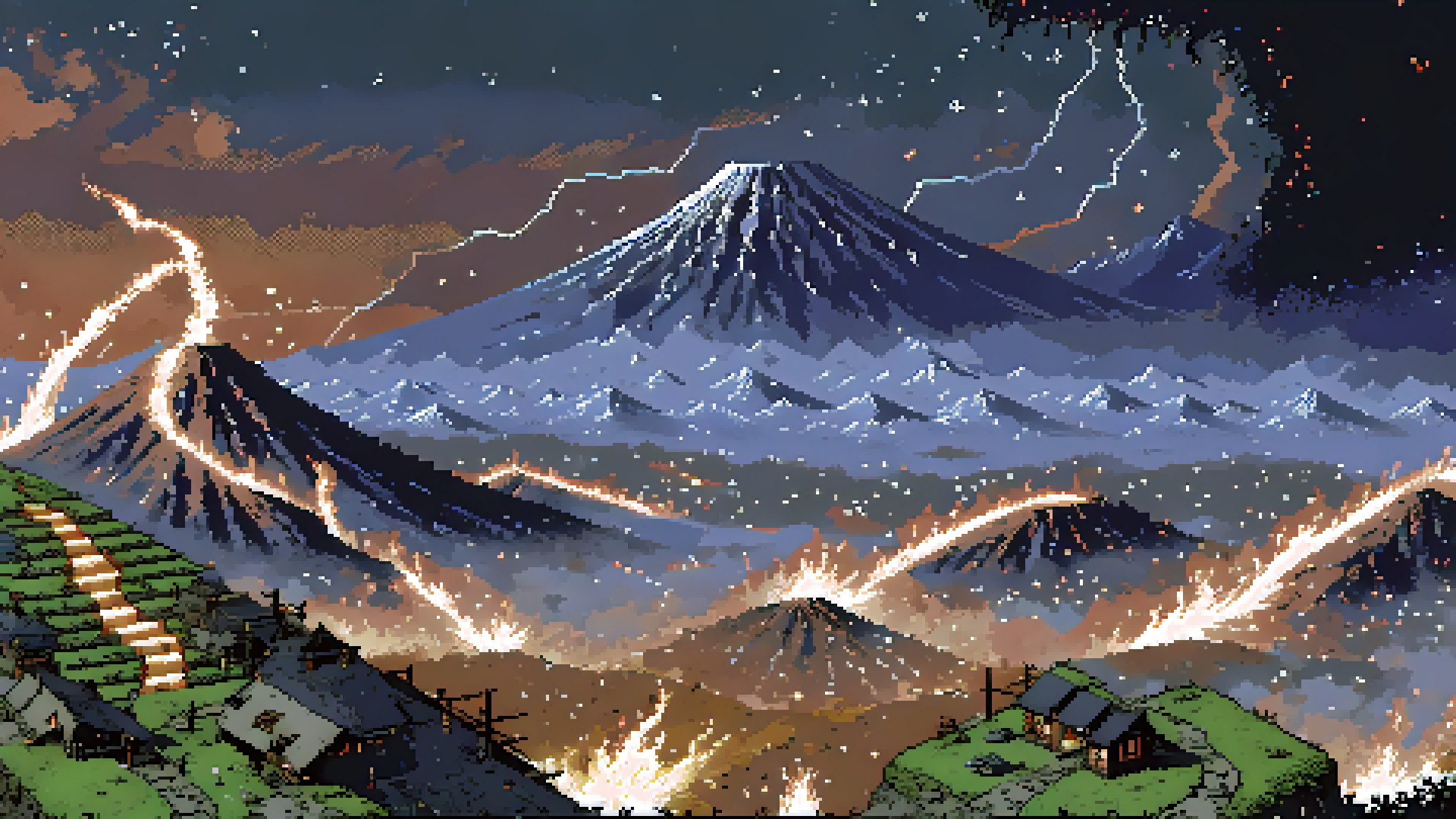 pixelart, <lora:pixhell15Lora_v10:0.6>, <lora:c64Graphics_v10:0.7>, a close-up of Ninja Village, farmland, shuriken, hoe, (ninja group, hordes of ninjas: 1.4), volcanic eruptions, Rain of Fire, war