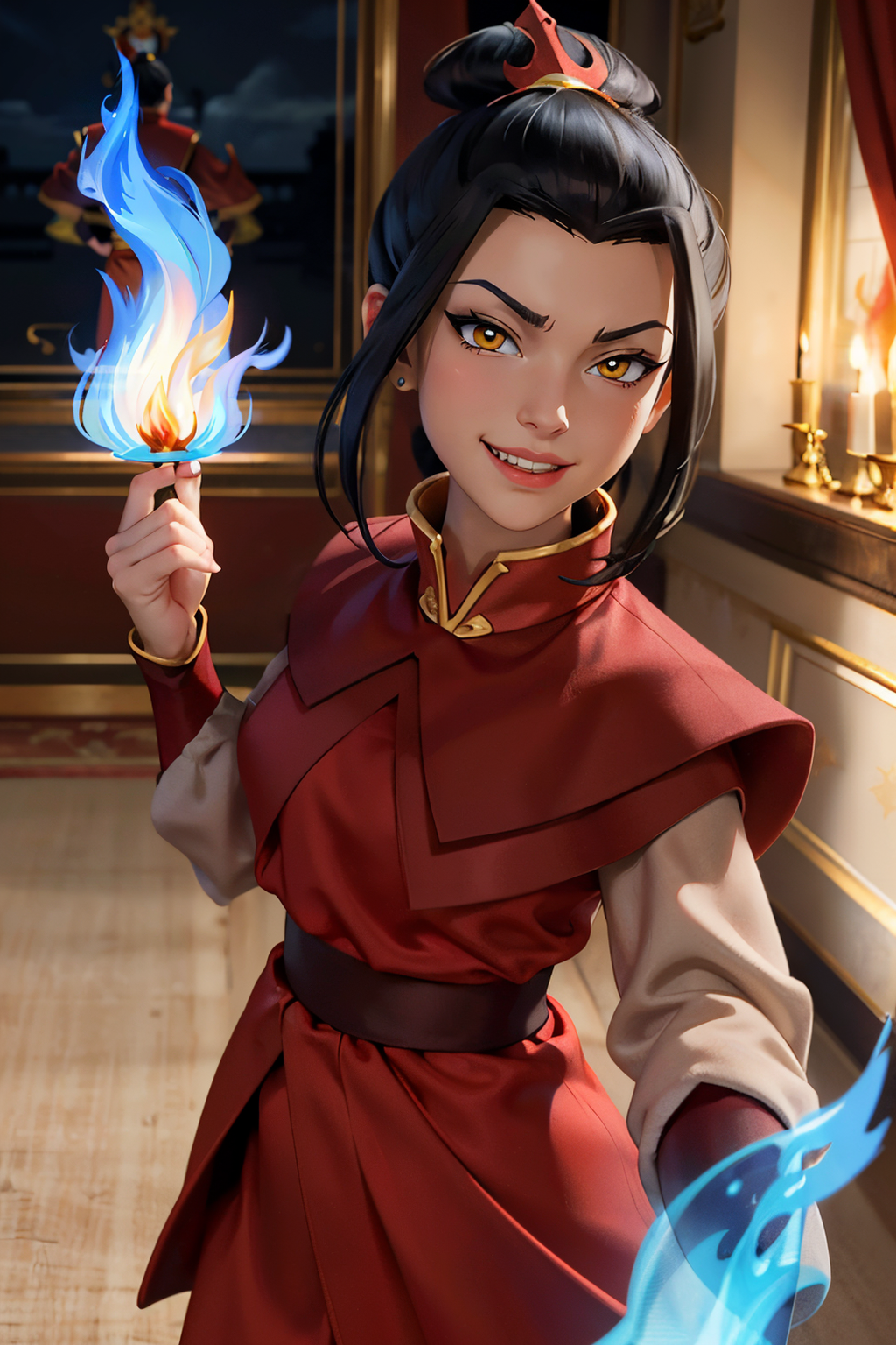 azula, yellow eyes, black hair, top knot, red clothes, looking at viewer, serious, evil grin, standing, palace room, blue colored fire, high quality, masterpiece, <lora:Azula:.7>