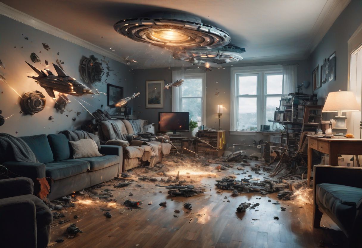 chaotic scene (Tilted frame,dutch angle,low shot, dynamic scene:1.6) ,photo of spaceships' battle scene inside (modern living room of a family house:1.7) (small fleet:0.8) of (toy size size highly developed floating starships:1.5) and having a fight inside a in the corridors of furnitures bombing eachother and furnitures, crash,boom,fire hyper realistic, (masterpiece:2) High resolution, cinematographic, volumetric lighting, wide angle lens,