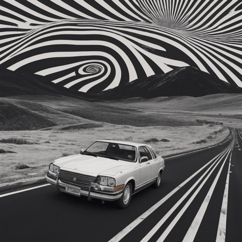 <lora:Linear-Delusion-000100:0.5>, LinearDelusion, landscape made from an abstract pattern, car driving through landscape