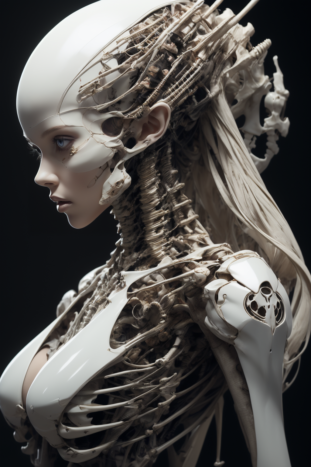 wide shot, 1 Girl, sexy slim girl, profile,long hair with slight curls, pose, exquisite and beautiful big eyes, exquisite features, detailed features, dark background, exo-bones mecha, bones, (half skeleton mask:0.8), half skeleton body, <lora:bones_20230817015333-000014:0.6>, <lora:cumbersome-block:0.4>, <lora:white mecha_20230730021614:0.4>,white mecha