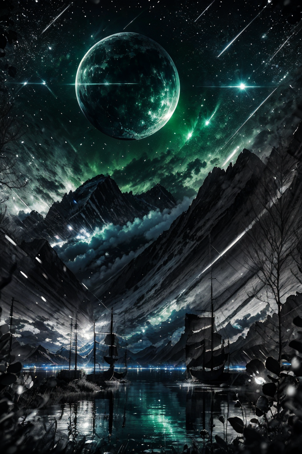 Highly detailed, High Quality, Masterpiece, beautiful, night, (dark environment), mountains, water, trees, <lora:DW-000008:1>