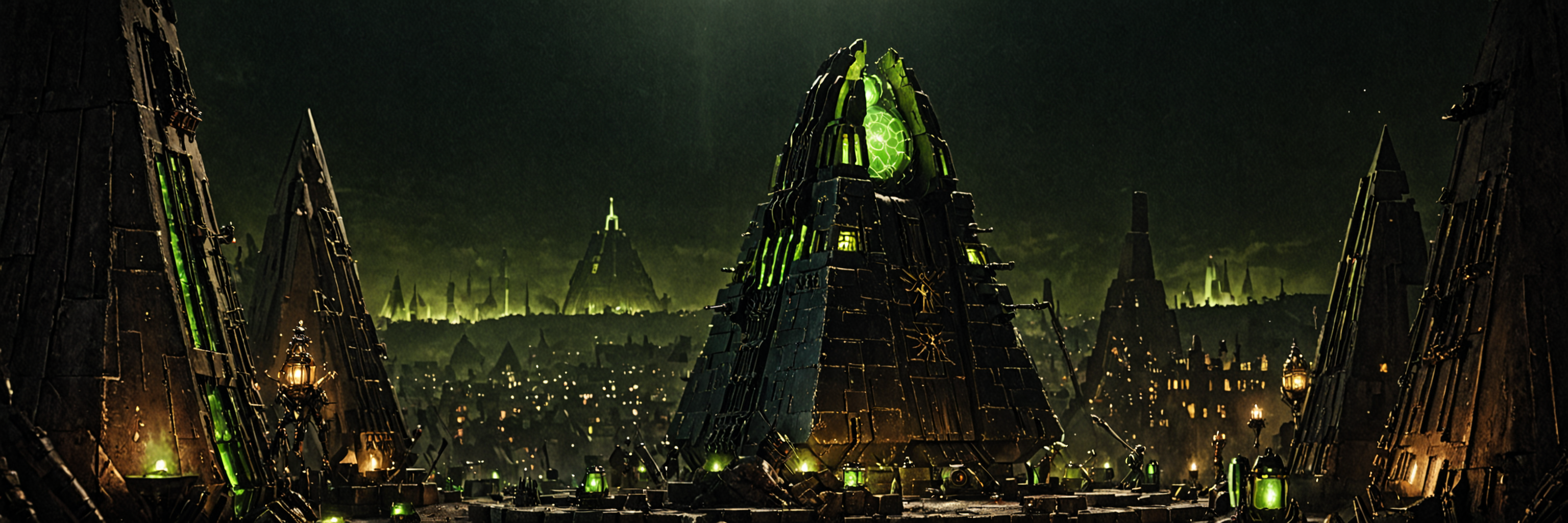 Generate a stunning art style, a true (masterpiece) (best quality) of art. The image showcases, (detailed linework), (dynamic shading), and (dramatic lighting), bringing to life a (dreading atmosphere, grim dark coloures) . BREAK (Necron_Architecture ,electricity, green glow, green theme,) gigantic green energy source BREAK In the background a (ancient tomb, symetrical complex green architecture, pyramid \(structure\), pyramid \(geometry\), warhammer 40k) is to be seen in (grand, high-scale:, panorama:2) from (from below). <lora:Necron_World_XL:1> <lora:sinfully_stylish_SDKL:1>